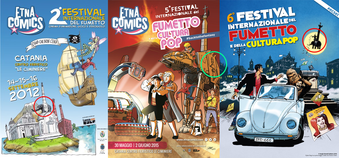 Il pachiderma, che ora svetta nel gonfalone comunale, della provincia e dell’università e mascotte di diverse associazioni sportive, non poteva non venire citato nelle locandine di Etna Comics, prima manifestazione del genere dell’isola da cui arrivano molti dei disegnatori nostrani.